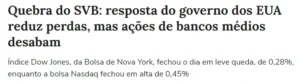 Um deles foi o colapso do Silicon Valley Bank (SVB), que pegou investidores e especialistas de surpresa; o terror estava instalado no Vale do Silício. Inclusive, esse parecia não ser um caso isolado, e o medo do contágio por todo o sistema bancário dos Estados Unidos se tornou real.