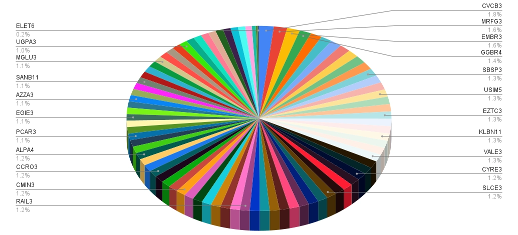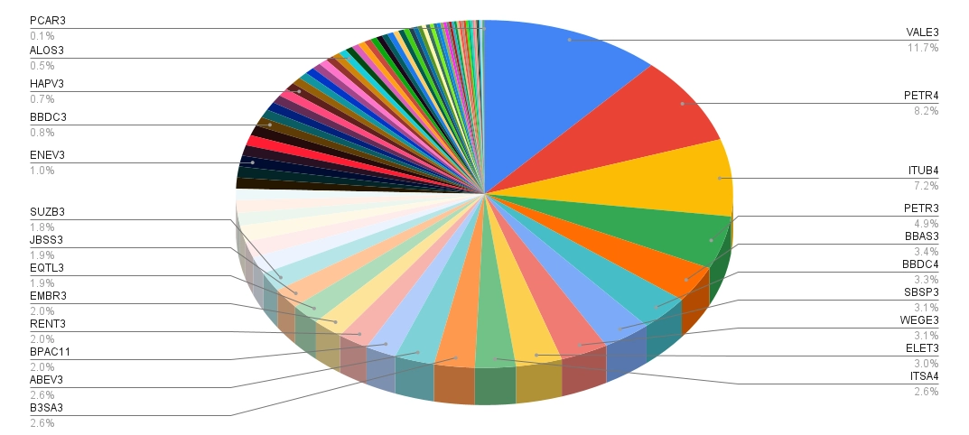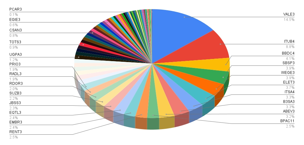 No momento, a carteira do IBOV tem 83 empresas, sendo as com maior peso: Vale, Petrobras, Itaú, Banco do Brasil e Bradesco.